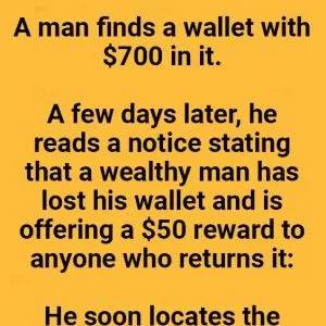 A few days later, he reads a notice stating that a wealthy man has lost his wallet and is offering a $50 reward to anyone who returns it: