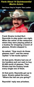 When Reynolds and Sinatra did finally come face-to-face, the crooner invited the actor to a poker game in the kitchen of the restaurant. Reynolds took Sinatra up on the offer and, as they – plus several other associates of Sinatra’s – got ready to play five-card stud, a busboy named Hector dropped a tray of glasses.