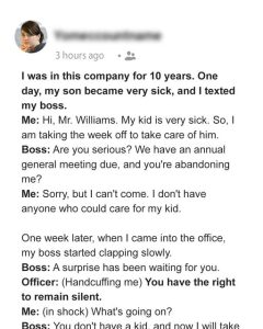 Yeah. No. That didn’t happen to me. Let me tell you everything. I’ve been working for a company for ten years. Straight out of college, I joined as a marketing intern and then worked my way up the corporate ladder — the pay increasing at an exceptionally slow rate. One day, my five-year-old son, Kenny, became very sick.